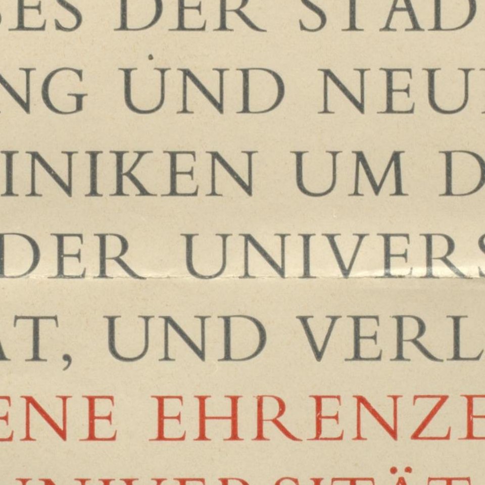 Probedruck der Urkunde zur Verleihung des goldenen Ehrenzeichens der Universität Wien an Hans Denk (1976) Bildgattung Dokument