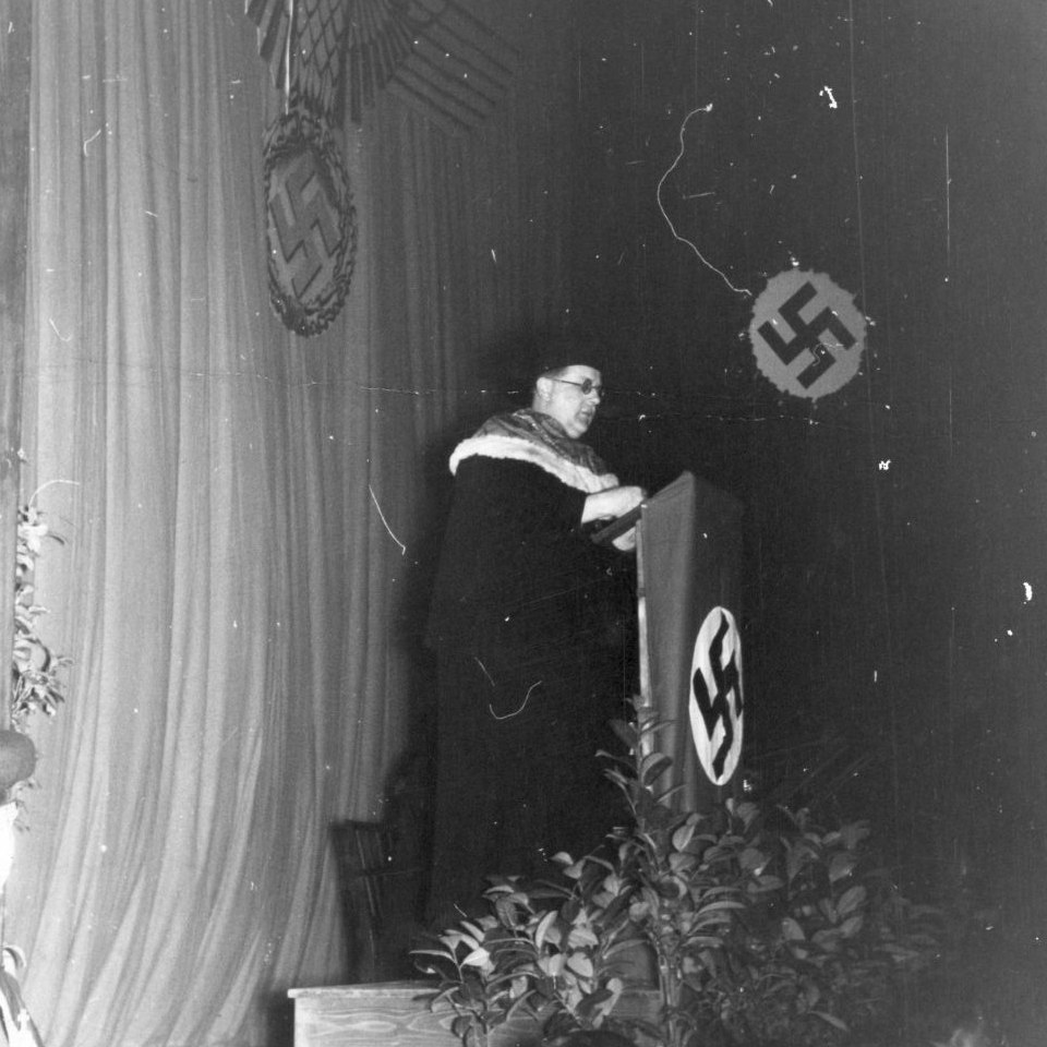 Rektor Eduard Pernkopf am Rednerpult bei einer akademischen Feier während der NS-Zeit Bildgattung Fotografie