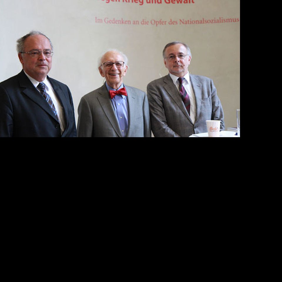 Rektor Heinz Engl, Nobelpreisträger Eric Kandel und Zeithistoriker Oliver Rathkolb bei der Präsentation des Sammelbandes „Der lange Schatten des Antisemitismus“, Aula der Universität Wien