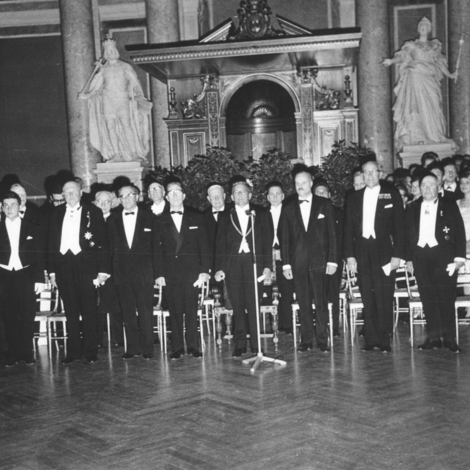 Rektor Nikolaus Hofreiter (Mitte) und andere Festgäste bei der Eröffnung des 1. Universitätsball im Großen Festsaal der Universität Wien