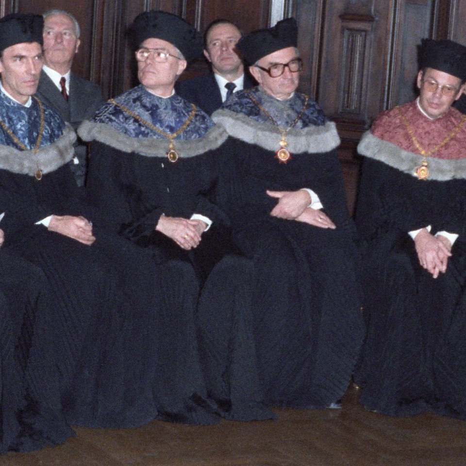 Rektoren und Dekane bei der Ernennung von Peter Henn zum Ehrenbürger der Universität Wien v.l.n.r.: Rektor Holczabek, Rektor Tuppy, Dekan Kubelka, Dekan Oberhammer, Dekan Mader, Dekan Öhlinger, Dekan Sauer, Dekan Langer Bildgattung Fotografie