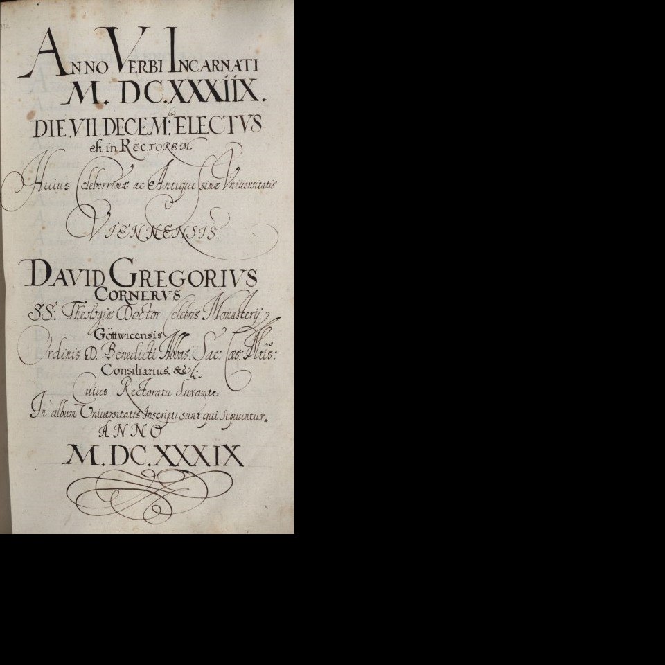 Rektorenblatt von David Gregor Corner (Rektor 1638/39) Quelle Aus der Hauptmatrikel der Universität Wien (Kodex M 6, fol. 55) Bildgattung Dokument