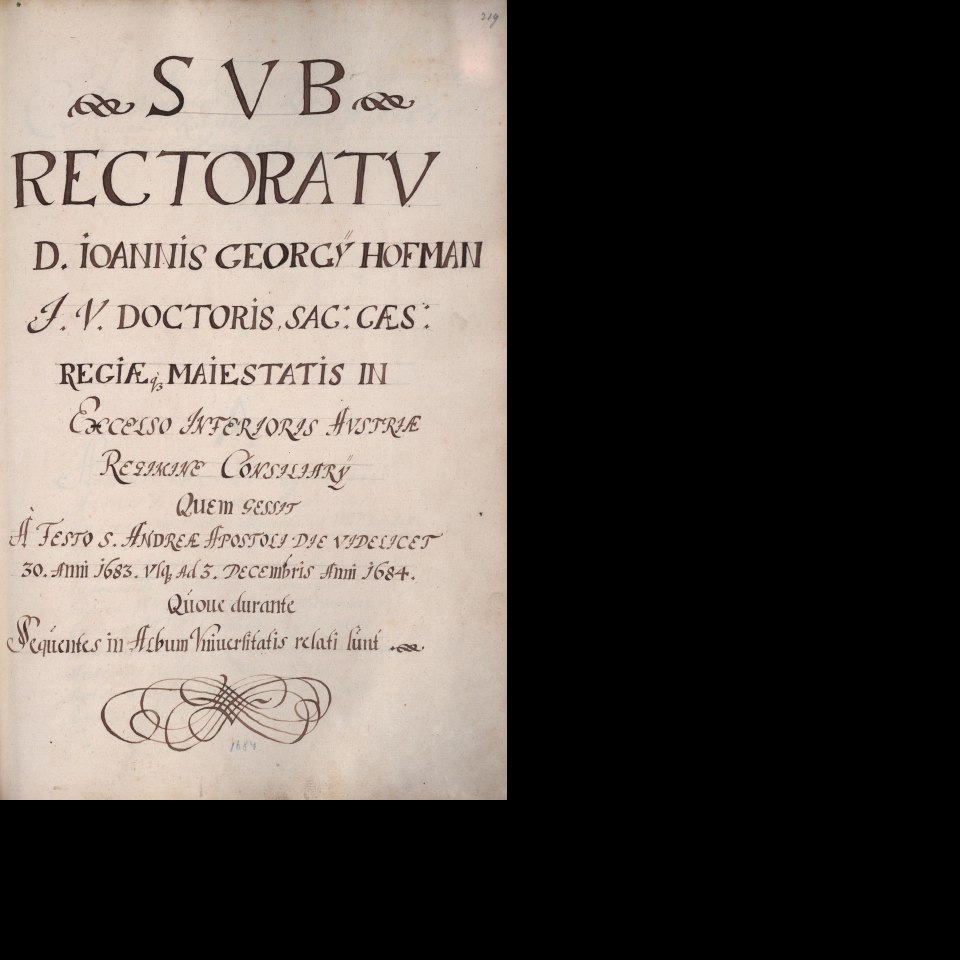 Rektorenblatt von Georg Hoffmann (Rektor 1683/84) Quelle Aus der Hauptmatrikel der Universität Wien (Kodex M 7, fol. 219) Bildgattung Dokument