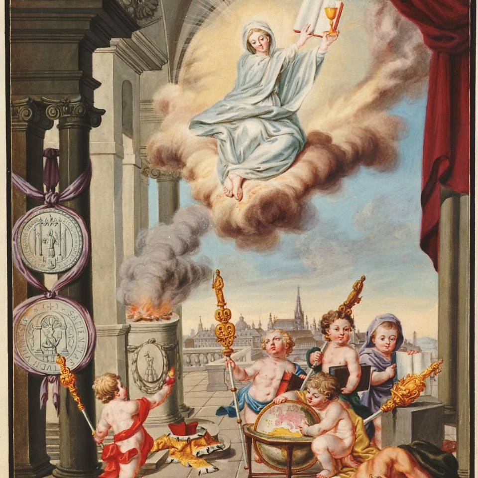 im Vordergrund allegorische Figuren, Universitätsinsignien und Wappen, im Hintergrund Ansicht von Wien