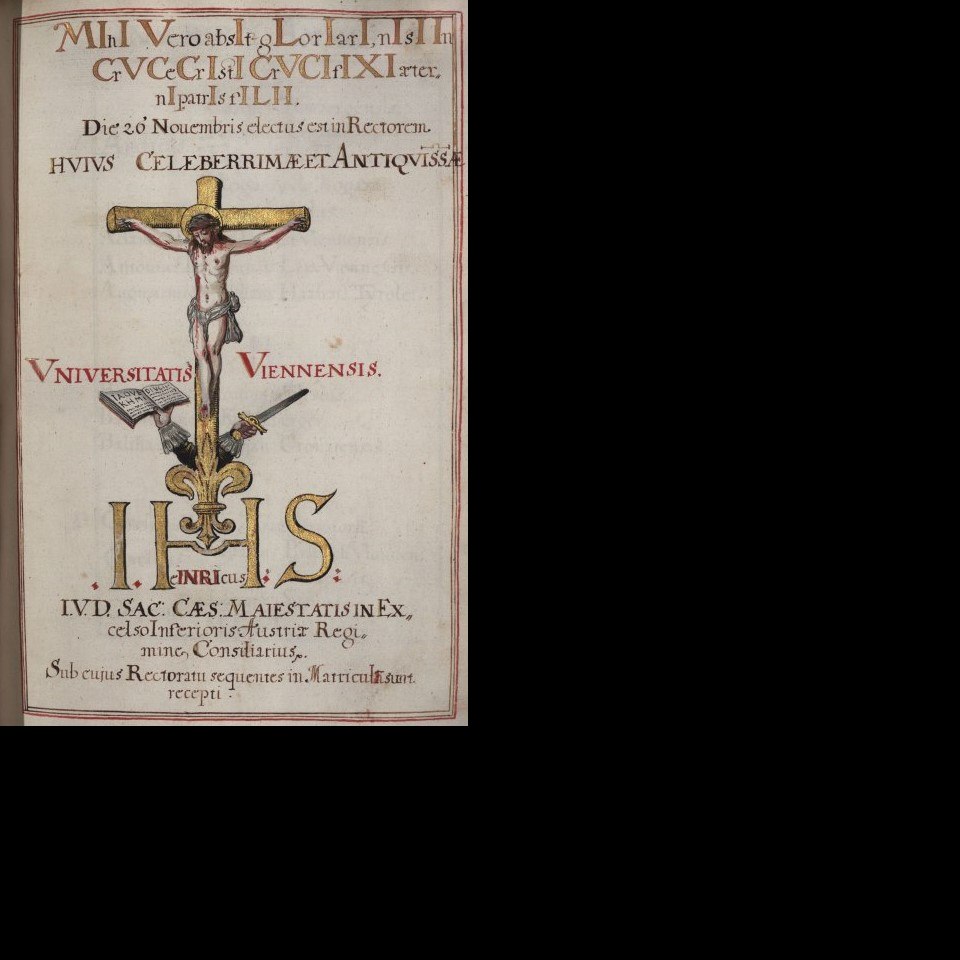 Rektorenblatt von Johann Heinrich Strasser (Rektor 1643/44) Quelle Aus der Hauptmatrikel der Universität Wien (Kodex M 6, fol. 97) Bildgattung Dokument