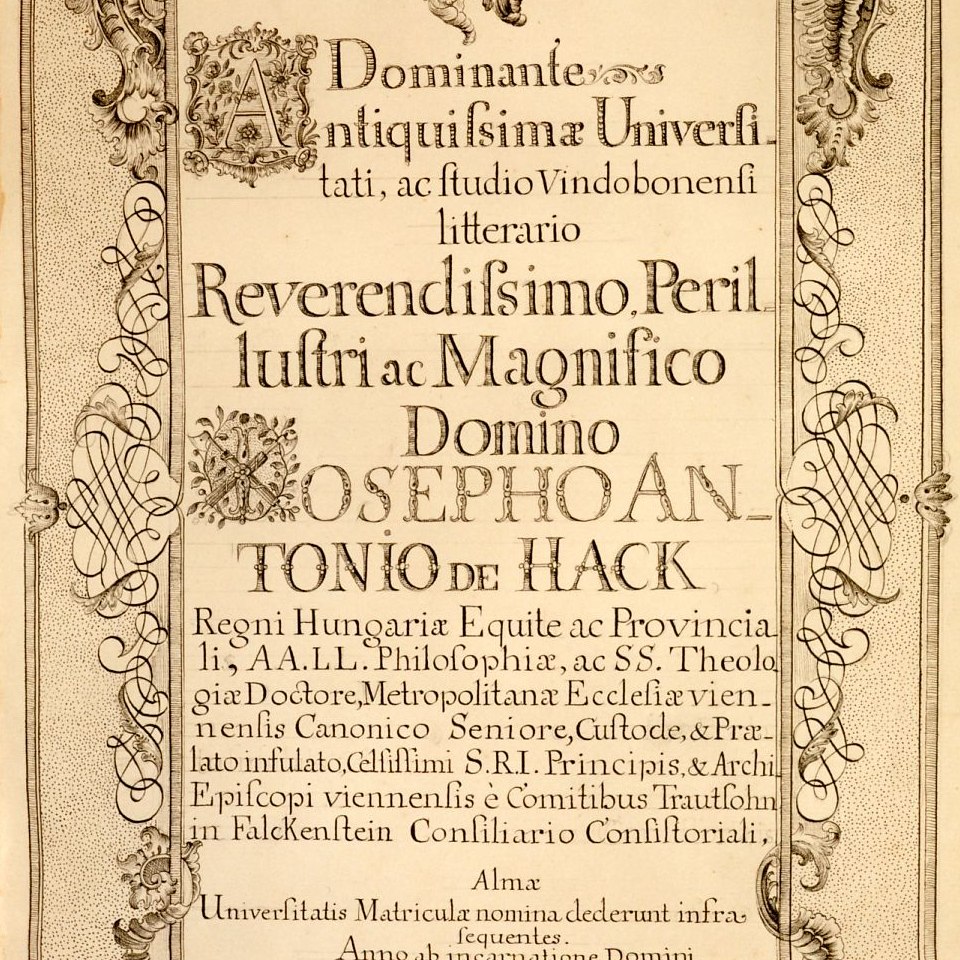 Rektorenblatt von Joseph Anton von Hack (Rektor 1750/51) Quelle Aus der Hauptmatrikel der Universität Wien (Kodex M 10, fol. 41) Bildgattung Dokument