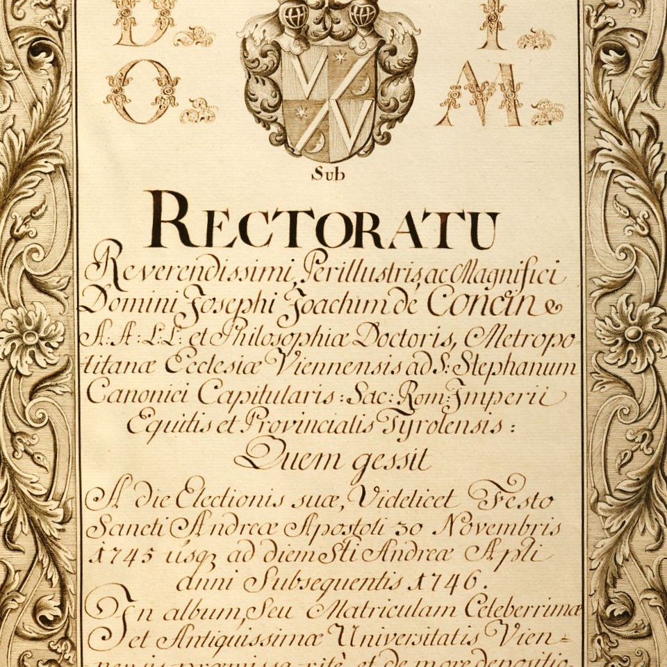 Rektorenblatt von Joseph Joachim von Concin (Rektor 1745/46) Quelle Aus der Hauptmatrikel der Universität Wien (Kodex M 9, fol. 358r) Bildgattung Dokument