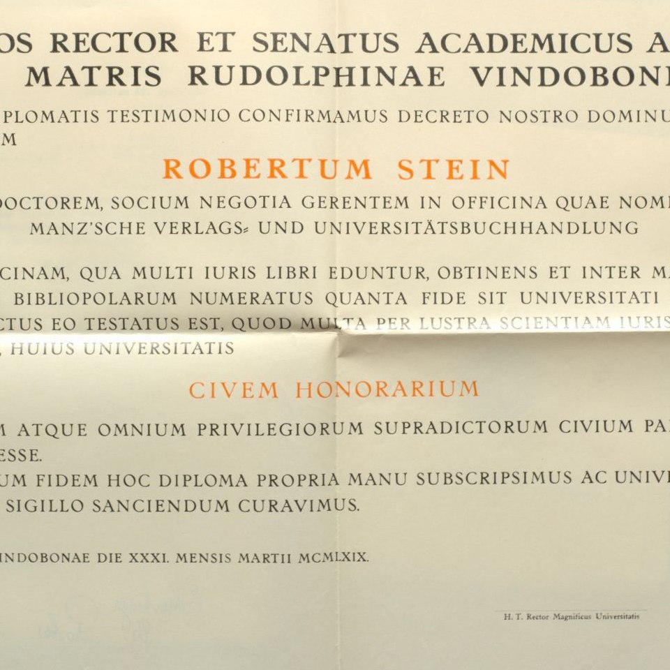 Ehrenbürgerdiplom für Robert Stein (1899-1970), der in dritter Generation den für Jurist*innen zentralen Wiener MANZ-Verlag leitete