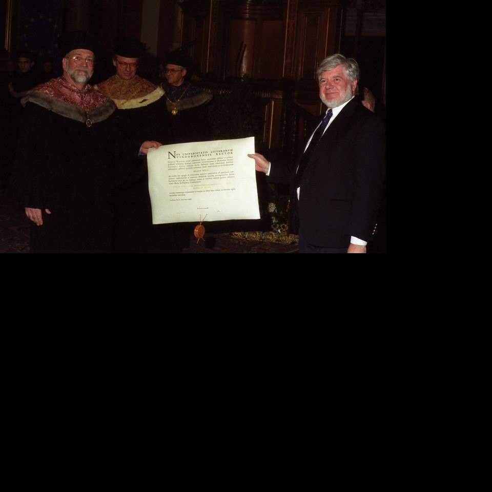 Roger Wets bei der Verleihung des Ehrendoktorats durch Dekan Günther Haring und Rektor Georg Winckler Bildgattung Fotografie