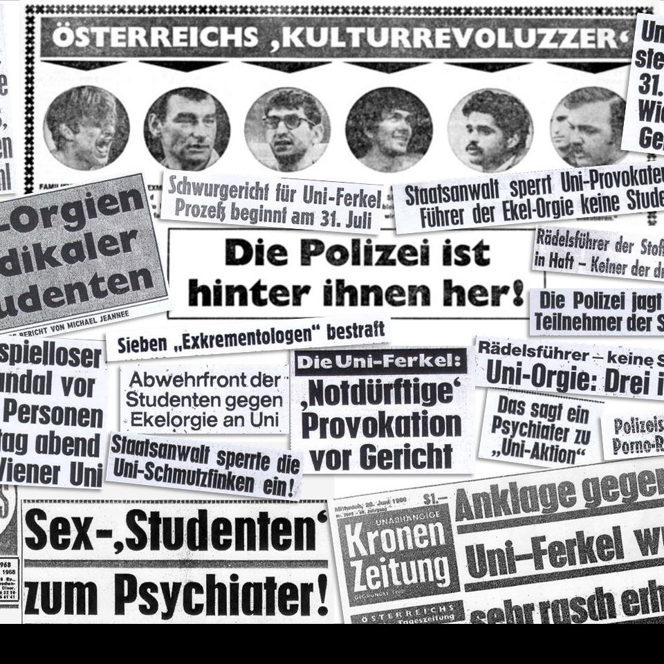 Schlagzeilen zur Aktion „Kunst und Revolution“ in österreichischen Tageszeitungen