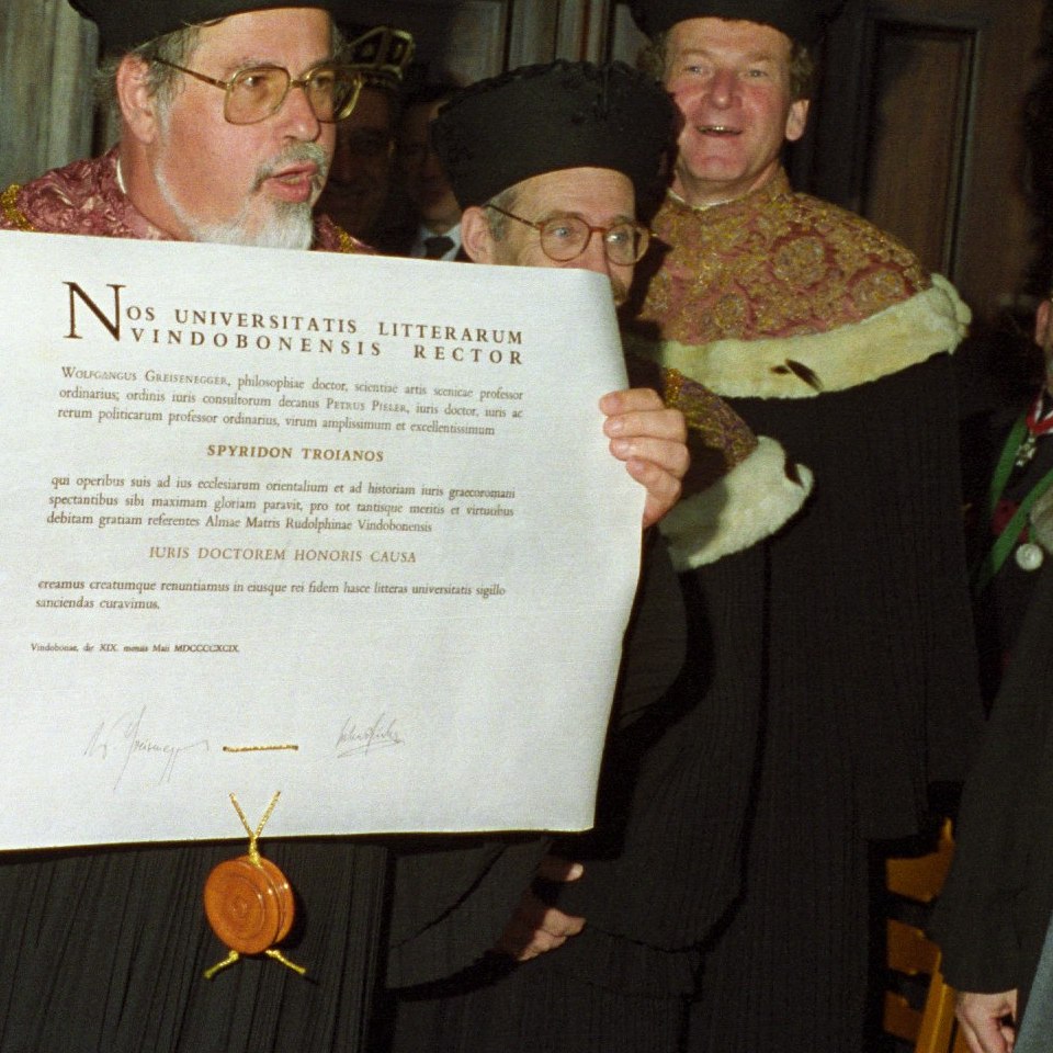 Spyros Troianos bei der Verleihung des Ehrendoktorats durch Dekan Peter E. Pieler Bildgattung Fotografie