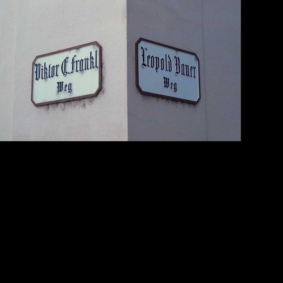 Straßenschilder am Campus der Universität Wien: Viktor E. Frankl Weg / Leopold Bauer Weg. Bildgattung Fotografie