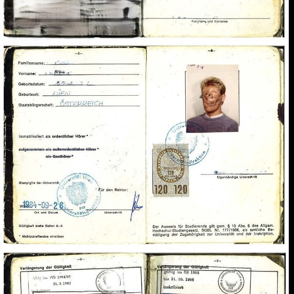 Studierendenausweis, wie er von Ende der 1960er Jahre bis Mitte der 1990er Jahre in Verwendung stand, der neben persönlichen Angaben auch je Semester einen Gültigkeitsstempel enthielt, an dene Studiendauer und Studienverlauf ablesbar sind.