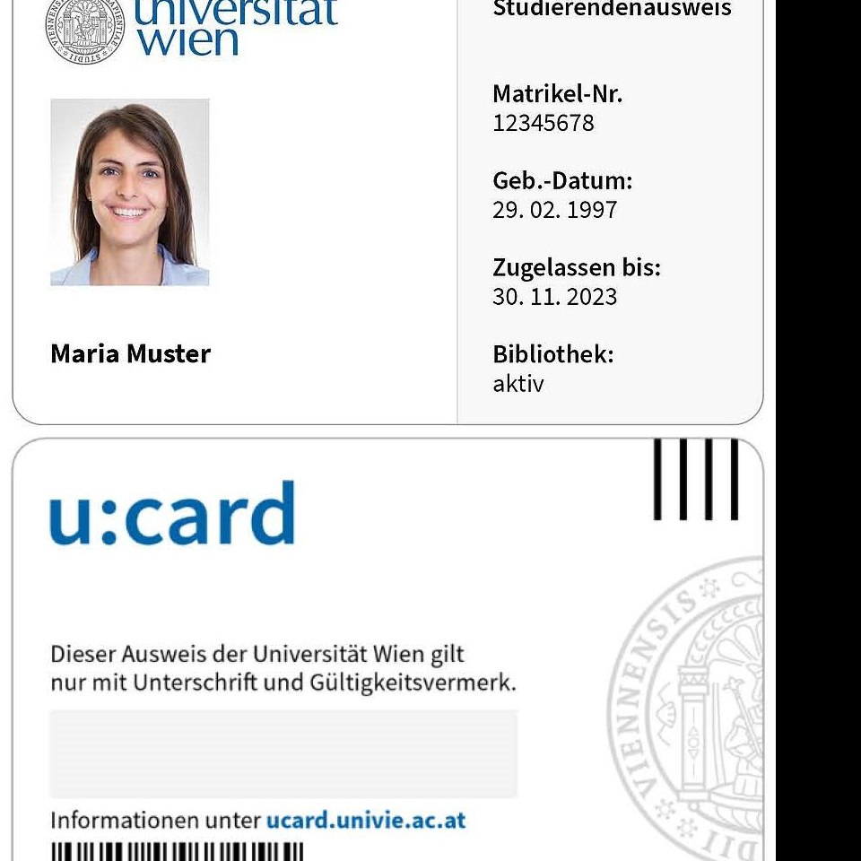 Muster einer "u:card" (Vorder- und Rückseite), die 2018 den Studierendenausweis aus Papier ablöste. Sie ist gleichzeitig auch Bibliotheksausweis. Die u:card muss jedes Semester in einem der u:card-Terminals digital validiert werden und erhält so ihre Gültigkeit für das jeweilige Semester.