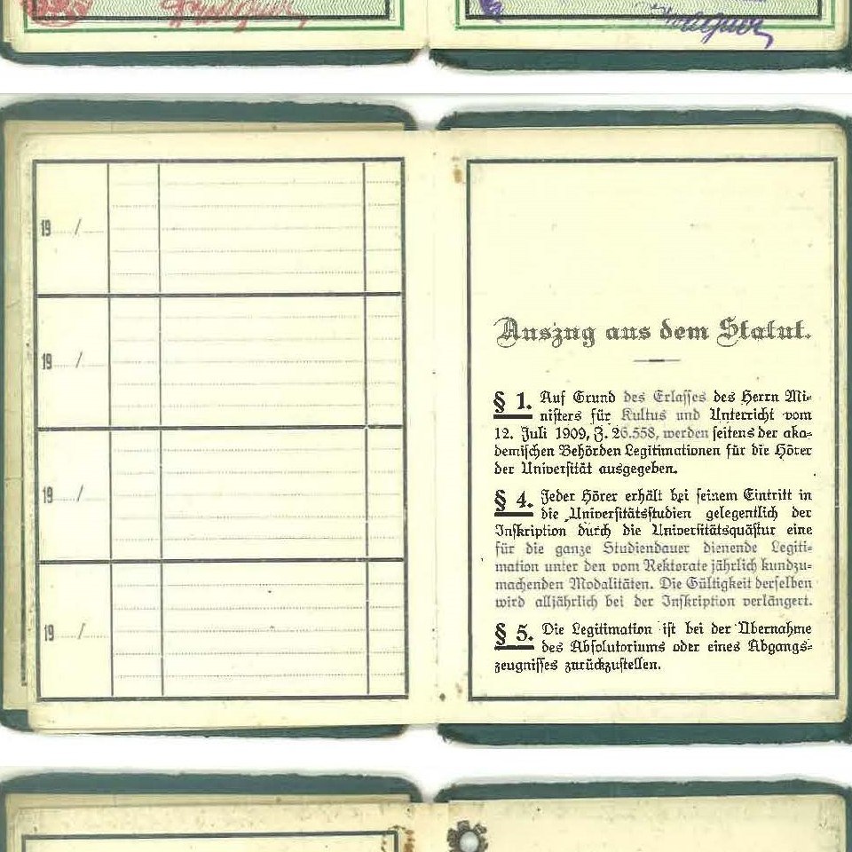 Studierendenausweis, wie er vom 19. Jahrhundert bis 1967/68 in Verwendung stand (hier jener der Medizinstudentin Rita Smrcka aus 1932, der bis 1938 verwendet wurde), der neben persönlichen Angaben auch je Semester einen Gültigkeitsstempel enthielt, an denen Studiendauer und Studienverlauf ablesbar sind und am Ende einige rechtliche Hinweise.