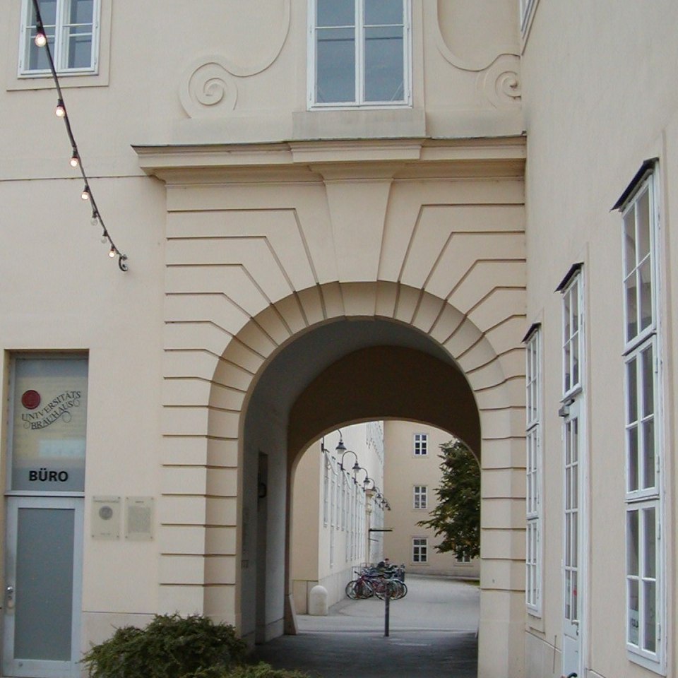 Suess-Tor der Erinnerung am Campus (ehemals AKH) zwischen Hof 1 und Hof 7, Blick von Hof 1, Zustand 2003 Bildgattung Fotografie