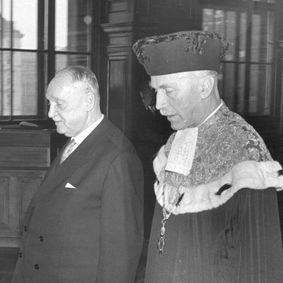 Tassilo Antoine (1895–1980), Medizin, bei seiner Inauguration zum Rektor mit Bundespräsident Adolf Schärf, 1959 Bildgattung Fotografie