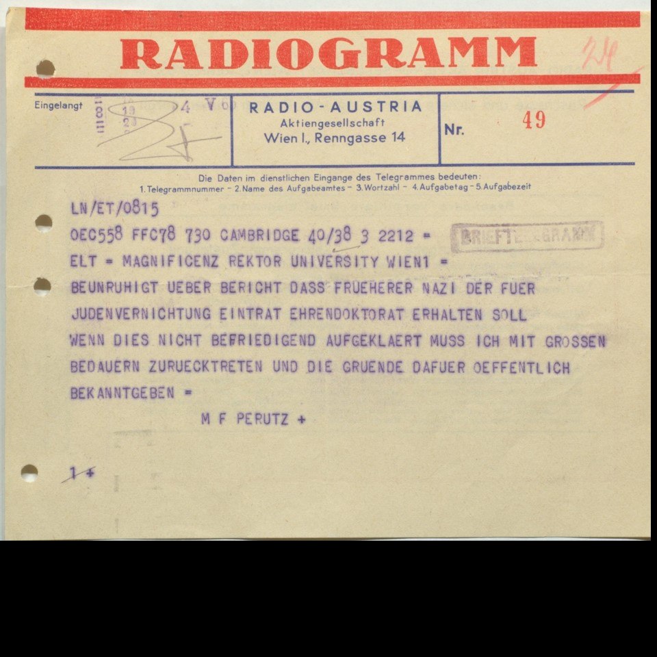 Telegramm von Max Ferdinand Perutz an Rektor Karl Fellinger, 4. Mai 1965