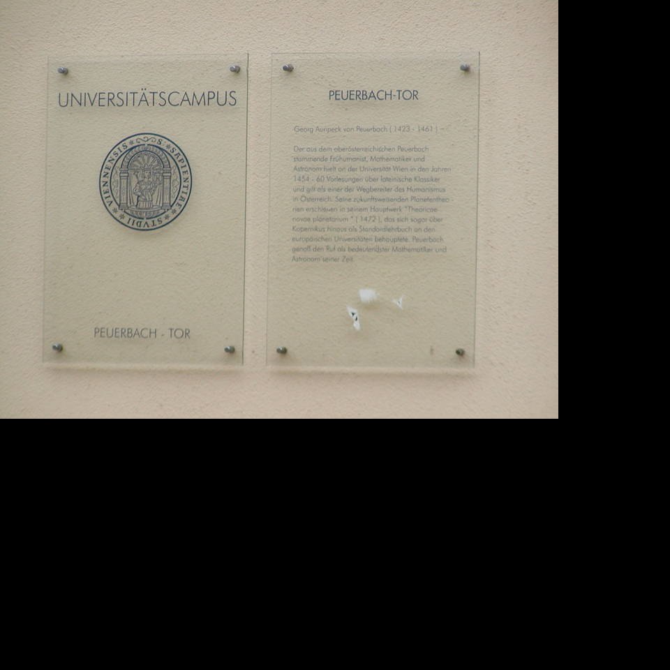 Peuerbach-Tor der Erinnerung am Campus zwischen Hof 6 und Hof 7, Originaltafeln von 1998 im Hof 6, Zustand 2003 Bildgattung Fotografie