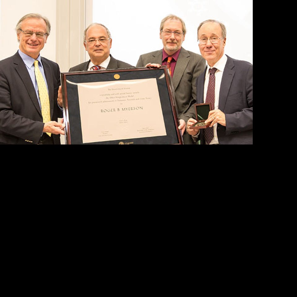Verleihung der Oskar-Morgenstern-Medaille an Roger Myerson durch Altrektor Georg Winckler, Rektor Heinz W. Engl und Dekan Oliver Fabel