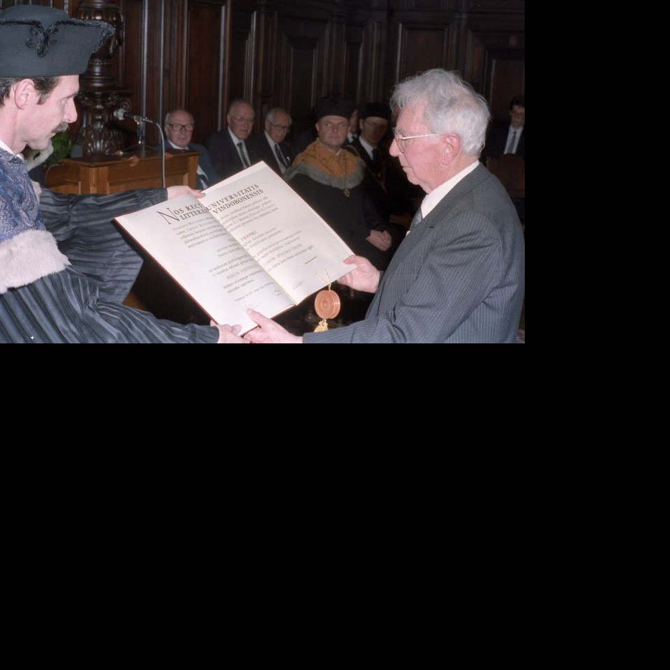 Verleihung des Ehrendoktorats der Universität Wien an Viktor Frankl, Überreichung des Ehrendoktordiploms durch Giselher Guttmann