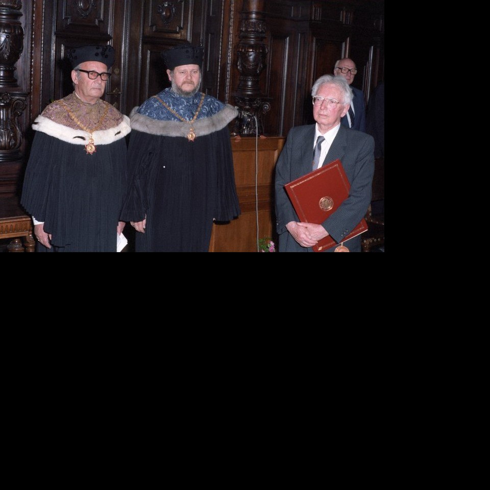 Verleihung des Ehrendoktorats der Universität Wien an Viktor Frankl Viktor Frankl mit Rektor Wilhelm Holczabek und Dekan Karl Wernhart Bildgattung Fotografie