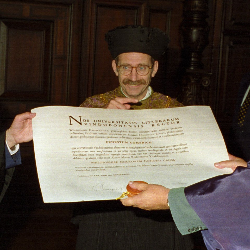Verleihung des Ehrendoktordiploms für Sir Ernst Gombrich, entgegengenommen von seinem Sohn Richard Gombrich überreicht durch Dekan Franz Römer und Rektor Wolfgang Greisenegger Bildgattung Fotografie