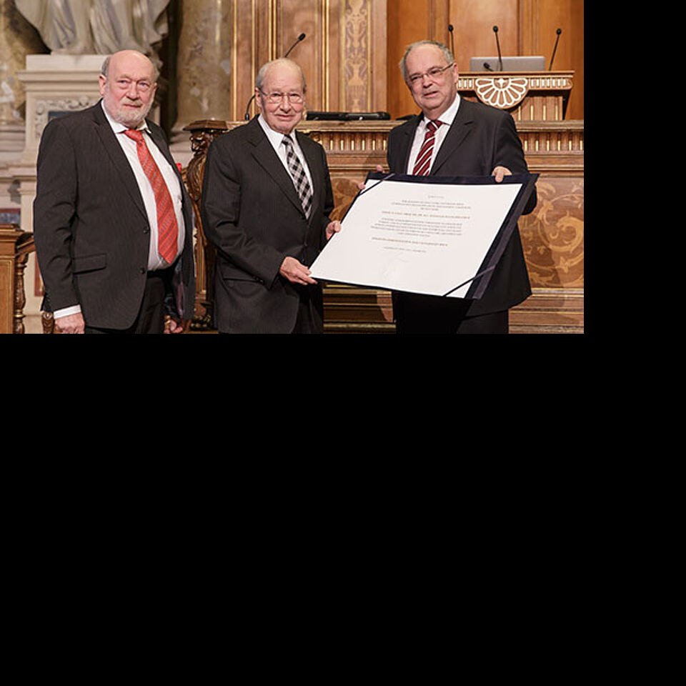 Verleihung des goldenen Ehrenzeichens an Wilhelm Fleischhacker, durch Dekan Horst Seidler und Rektor Heinz Engl Quelle https://medienportal.univie.ac.at/uniview/uni-intern/detailansicht/arti… Bildgattung Fotografie