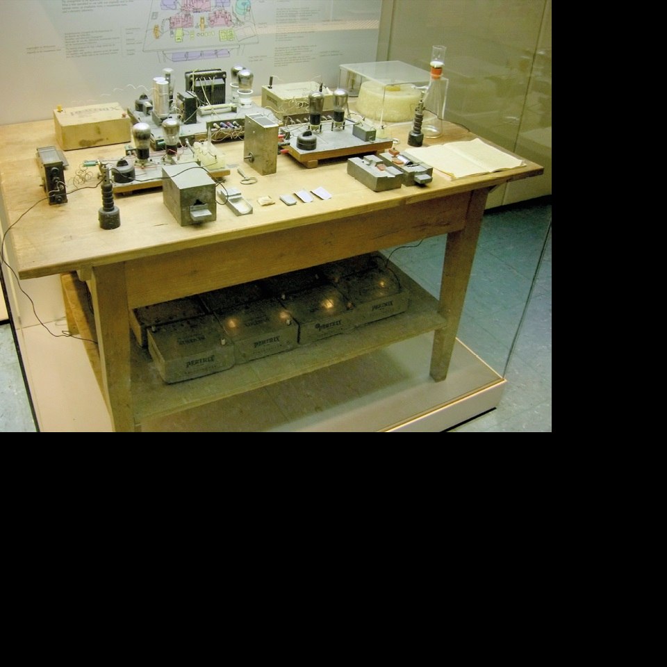 Versuchsaufbau, mit dem Otto Hahn und Fritz Straßmann am 17. Dezember 1938 in Berlin erstmals Uranium mit Neutronen bombardierten und dabei Barium entstand. Meitner erkannte den Vorgang als Kernspaltung und berechnete die freiwerdende Energie.