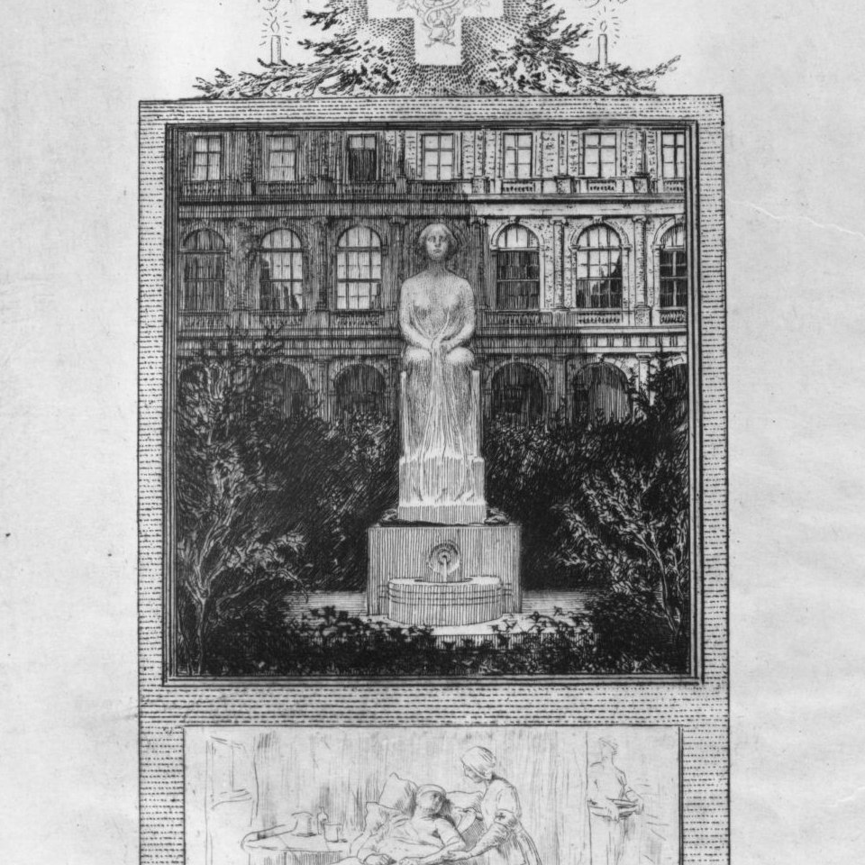 Weihnachtsgabe des Verwundetenspitals der k. k. Universität Wien 1915: Gedenkblatt mit Abbildung des Kastaliabrunnens im Arkadenhof sowie einer Szene aus einem Krankenzimmer, 1915