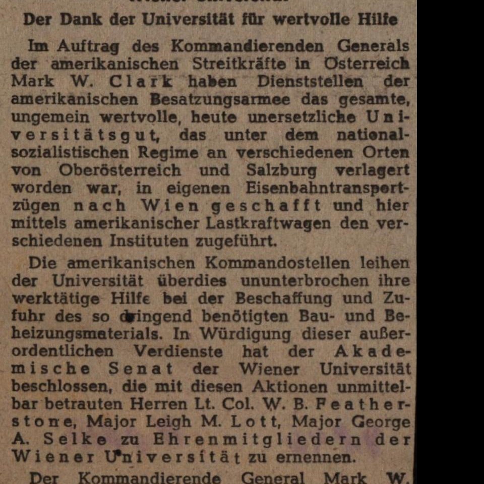 Zeitungsartikel „Amerikanische Offiziere – Ehrenmitglieder der Wiener Universität“, in: Neues Österreich, 9.2.1946