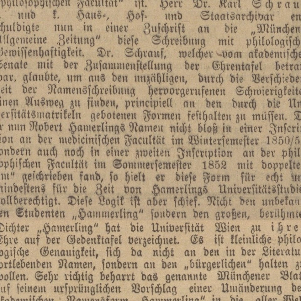 Zeitungsartikel „Monumentale Orthographie“, in: Wiener Allgemeine Zeitung, 21.06.1893