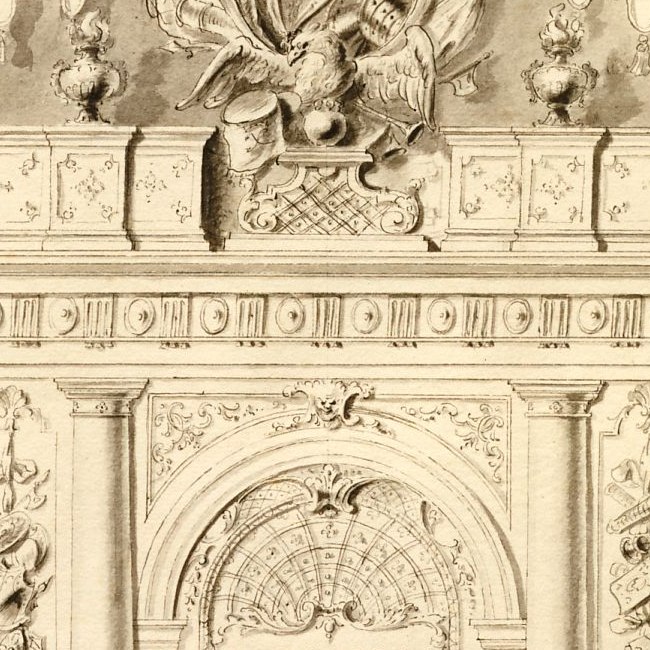 Säulenhalle mit allegorischen Figuren, in der oberen Bildhälfte befindet sich ein Porträt von Karl VI., während in der unteren Bildhälfte allegorische Figuren mit dem Wappen und einer Karte von Sizilien abgebildet sind, unterhalb steht: Anno qvo Sicilia fortitvdini et constantiae Caroli restitvta, Philippvs andegavensis veros pacis perpetae fructus expetiit.