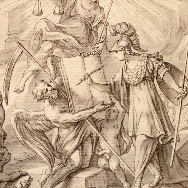 im Vordergrund allegorische Figuren, Universitätsinsignien und Wappen, im Hintergrund Ansicht von Wien