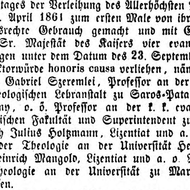 Verleihung des Ehrendoktorates an Gabriel Szeremlei, Karl Kuzmany, Heinrich Julius Holtzmann und Wilhelm Mangold