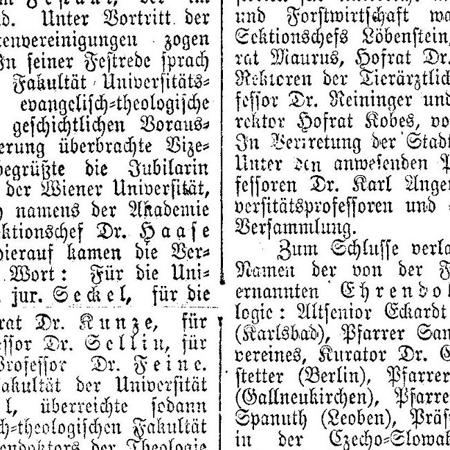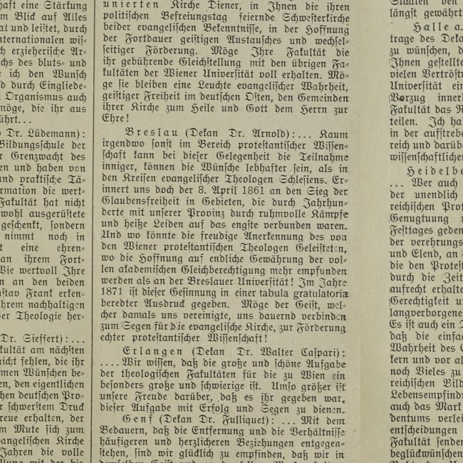 Zeitungsartikel über die "doppelte Halbjahrhundertfeier" der Wiener Evangelisch-Theologischen Fakultät am 12. Mai 1911 zum 50. Jahrestag des Protestantenpatentes (8. April 1861) sowie der Sanktion des Promotionsrechts (18. Juli 1861).