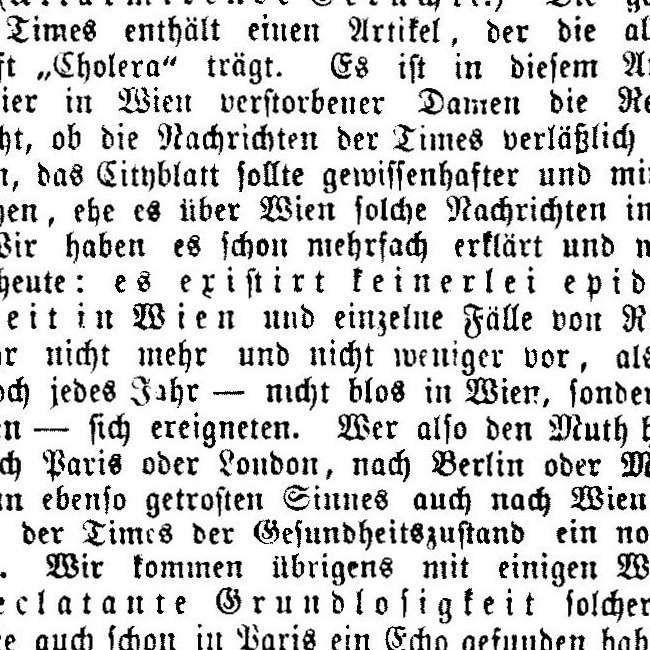 1873, im Jahr der Wiener Weltausstellung, brach die Cholera ein letztes Mal in Wien aus. Binnen vier Monaten - Juli bis Oktober 1873 - starben fast 3000 Menschen in Wien an der Epidemie. Erste Nachrichten über Cholera-Erkrankungen in Wien wurden bereits Anfang Juli 1873 über ausländische Medien publik gemacht - von der Wiener Presse jedoch vehement als grundlose Falschmeldungen abgetan, um den Verlauf der Weltausstellung nicht zu gefährden.