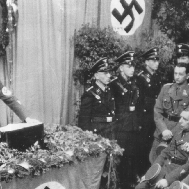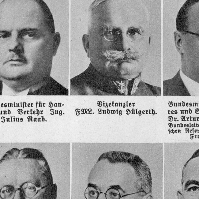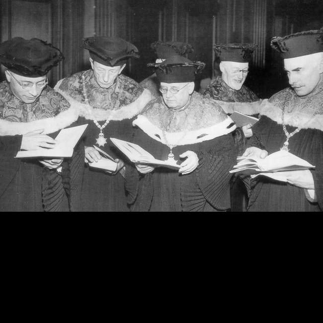 Inauguration des Rektors für das Studienjahr 1949/50: CARE-Mission schenkt der Universität wissenschaftliche Bücher: Dekan der Katholisch-Theologischen Fakultät Johannes Kosnetter, Dekan der Philosophischen Fakultät Hans Leitmeier, Rektor Richard Meister, Senator Johann Soelch, Dekan der Rechts- und Staatswissenschaftlichen Fakultät Johann Schima)