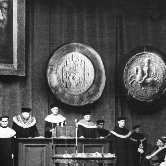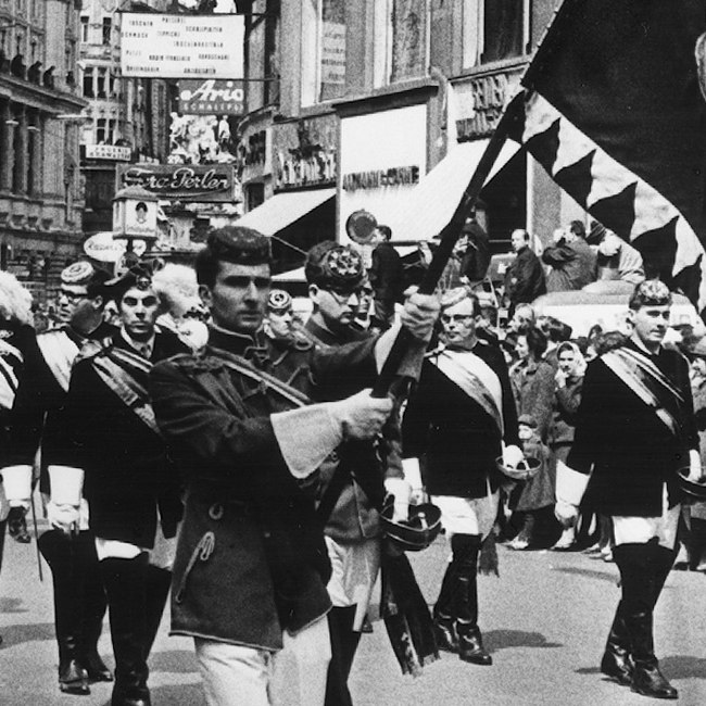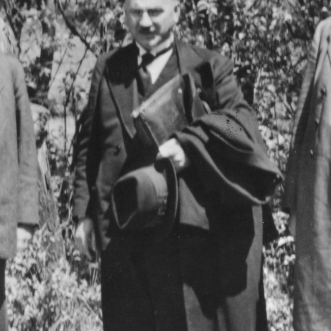Die Professoren Gustav Entz und Richard Hoffmann sowie der evangelische Bischof Hans Eder bei einer Studentenwanderung im Wienerwald, Frühjahr 1938.