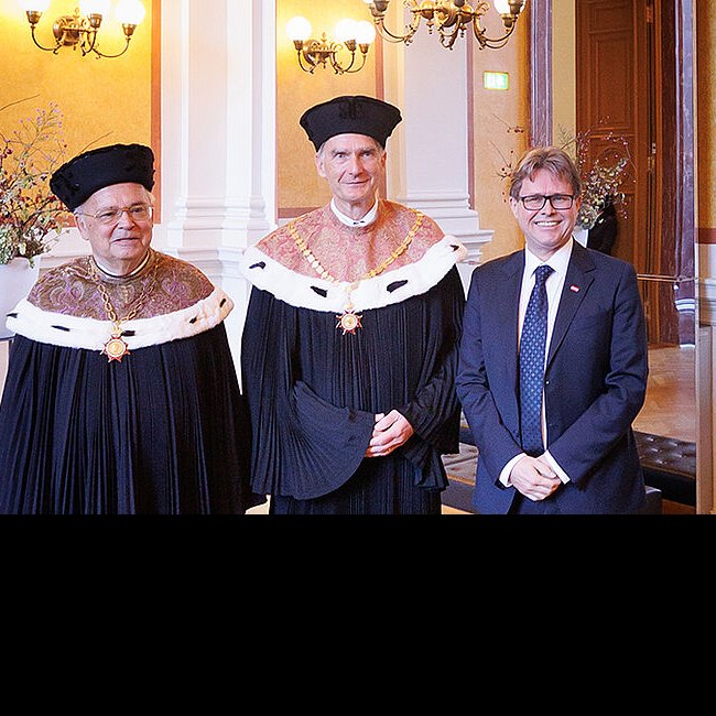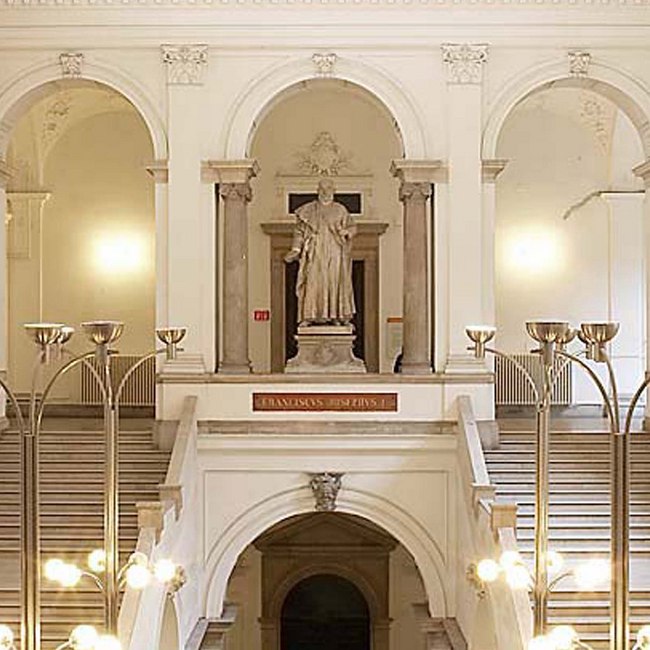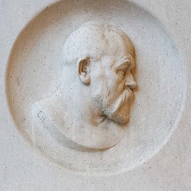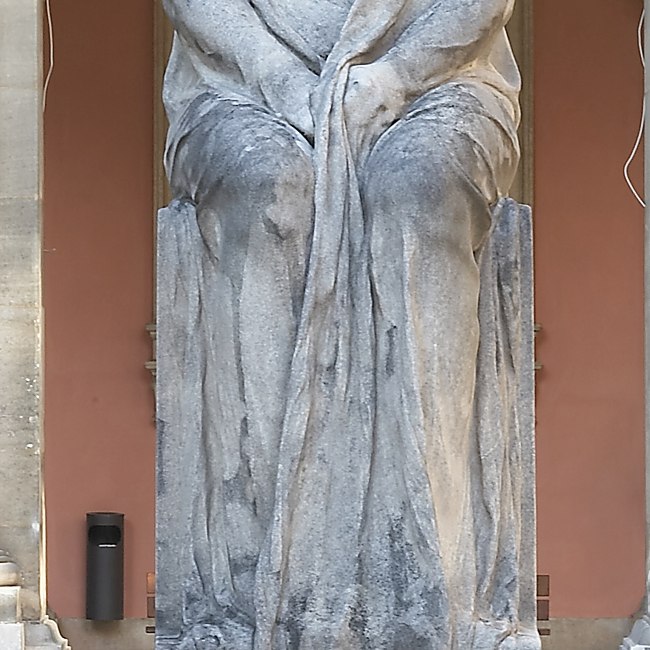 Die Giebelgruppe 'Philosophie' von Edmund Hellmer, 1877. Heinrich Ferstel, der Architekt des Universitätsgebäudes an der Ringstraße, hat auf die künstlerische Ausgestaltung der Fassaden großen Wert gelegt und ein umfassendes ikonographisches Programm entworfen, das sowohl Gestalten der griechischen Mythologie als auch der Wissenschaftsgeschichte einbezieht. Bestimmte Fassadenzonen waren den einzelnen Fakultäten und ihren Teildisziplinen vorbehalten, u.a. für alle eine alegorische Figurengruppe für jede der damals bestehenden vier Fakultäten - Edmund Hellmer gestaltete die "Philosophische" und die "Katholisch-Theologische Fakultät".