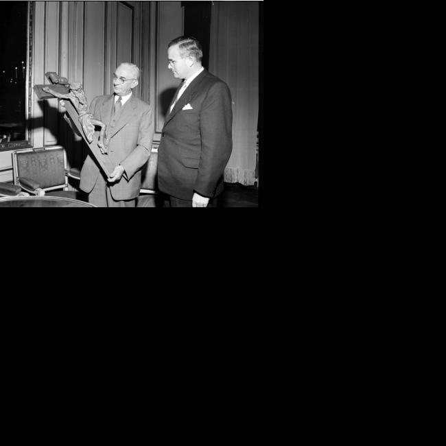 US-Zoologe und 1947-1950 Leiter der Bildungsabteilung der USAF in Österreich und Ernst Kolb im Unterrichtsministerium mit Kreuz