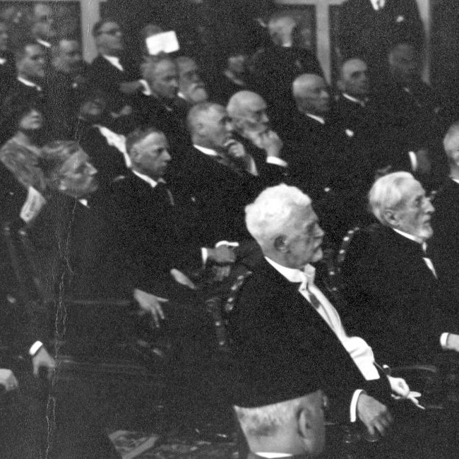1. Reihe der Festgäste von links nach rechts: Bürgermeister Richard Schmitz, Bundespräsident Wilhelm Miklas, Bundeskanzler Kurt Schuschnigg, BM f.Unterricht Hans Pernter, BM f.Justiz Adolf Pilz, Altbundespräsident Michael Hainisch, ?, Staatssekretär Michael Skubl, Polizeipräsident, Sektionschef Dr. Franz Gruber (BM. f. Finanzen)