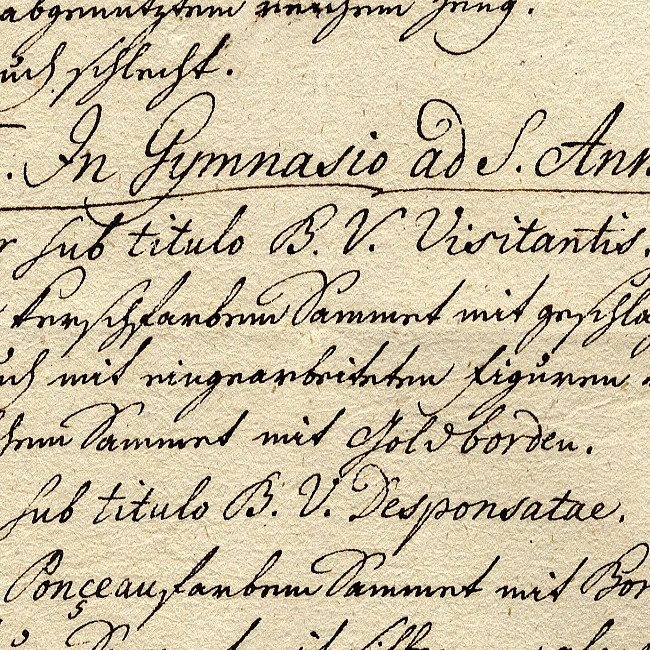 Nach der Auflösung des Jesuitenordens wurden auch die Kongregationen neu organisiert. U.a. wurden die Vermögenswerte erhoben, hier ein Verzeichnis der Fahnen, die im Besitz der Kongregationen am Akademischen Gymnasium und bei St. Anna waren.