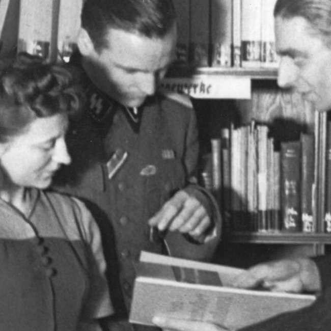 "Mimus unter der Gelehrtenbrille | Oberspielleiter und Dozent Dr. Vagn Börgehält im Zentralinstitut ein Kolloquium über *praktische Dramaturgie des Films'ab. Studierende holen sich hier bei der Arbeit in einem der schönen Bibliotheksräume seinen Rat in einer theaterwissenschaftlichen Frage", Pressefoto Atlantic/Schwarz, Berlin,
