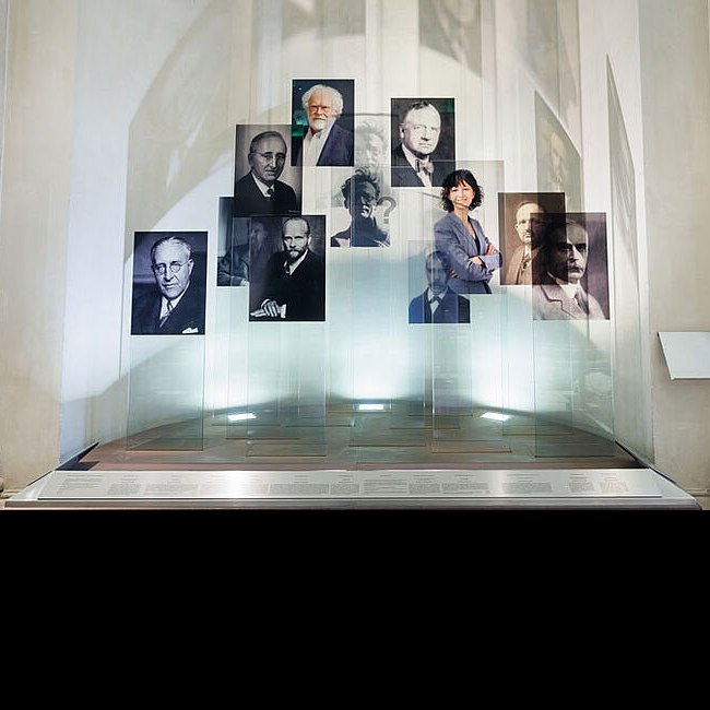 Installation „Nobelpreis und Universität Wien – Gruppenbild mit Fragezeichen“ von Bele Marx & Gilles Mussard (2006/2025), Erweiterung 2025, eröffnet am dies academicus, 12. Märrz 2025, in Anwesenheit der Nobelpreisträger*innen Anton Zeilinger und Emanuelle Charpentier