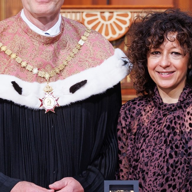 Nicola Roehlichnach der Ernennung zur Ehrensenatorin am dies academicus 2025, mit Rektor Sebastian Schütze im Großen Festsaal der Universität Wien.