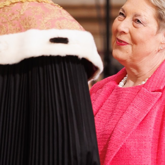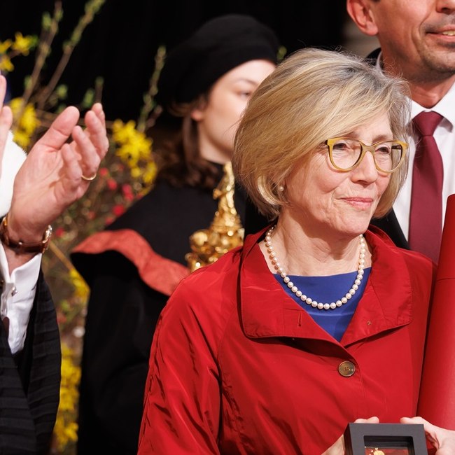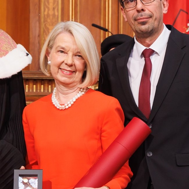 Ilse Schrittesser nach der Ernennung zur Ehrensenatorin am dies academicus 2025, zwischen Rektor Sebastian Schütze und Senatsvorsitzendem Stefan Krammer im Großen Festsaal der Universität Wien.