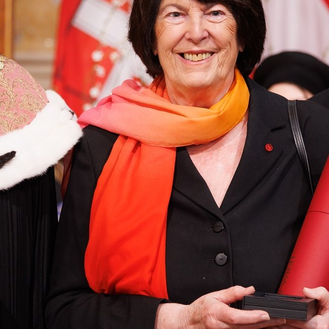 Eva Nowotny nach der Ernennung zur Ehrensenatorin am dies academicus 2025, zwischen Rektor Sebastian Schütze und Senatsvorsitzendem Stefan Krammer im Großen Festsaal der Universität Wien.