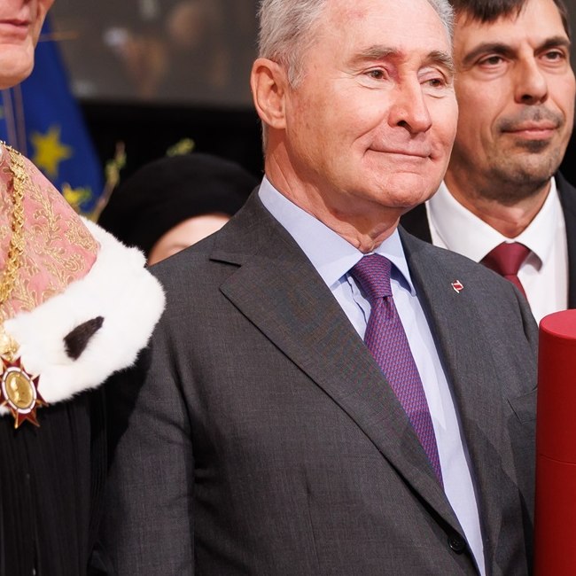 Gerhard Mayr nach der Ernennung zum Ehrensenator am dies academicus 2025, zwischen Rektor Sebastian Schütze und Senatsvorsitzendem Stefan Krammer im Großen Festsaal der Universität Wien.