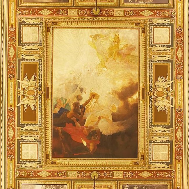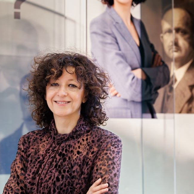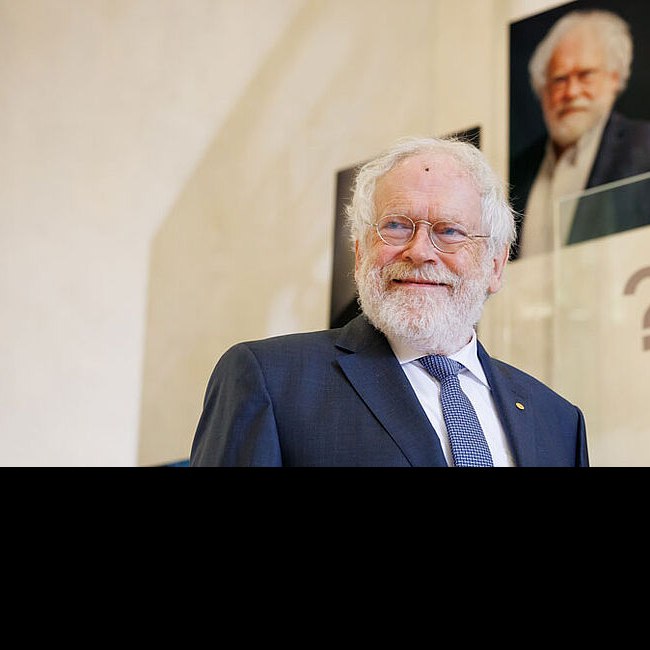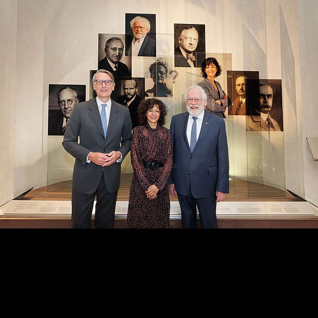 Installation „Nobelpreis und Universität Wien – Gruppenbild mit Fragezeichen“ von Bele Marx & Gilles Mussard (2006/2025), Eröffnung der Erweiterung am dies academicus am 12. März 2025, Rektor Sebastian Schütze, Nobelpreisträgerin Emanuelle Charpentier und Nobelpreisträger Anton Zeilinger vor der erweiterten Installation in der Aula der Universität Wien